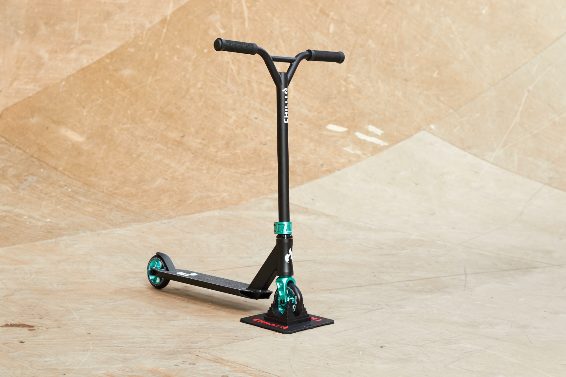 Too big for the 3000 but still too small for the 5000? The Chilli Pro Scooter 4000 is the golden mean between the two Scooters. The robust T-Bar made of chrome-molybdenum steel has a height of 53 cm. The lightweight aluminium Deck is particularly suitable for your first tricks in the park. The Scooter also has a Pro Spider HIC compression system and 110 mm aluminium core Wheels with ABEC 9 bearings and extra high rebound. Perfect for young riders who want to go high. Â The total height of the scooter is 77cm.